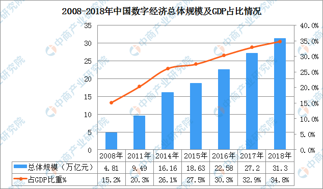 從總量上來看,近年來中國數字經濟規模保持快速增長,占GDP比重持續上升。根據信通院測算數據顯示,2018年我國數字經濟總量達到31.3萬億元,占GDP比重超過三分之一,達到34.8%,占比同比提升1.9個百分點。數字經濟蓬勃發展,推動傳統產業改造提升,為經濟發展增添新動能,2018年數字經濟發展對GDP增長的貢獻率達到67.9%,貢獻率同比提升12.9個百分點,超越部分發達國家水平,成為帶動我國國民經濟發展的核心關鍵力量。