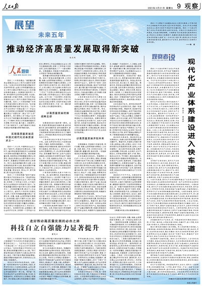 黨的二十大擘畫了全面建成社會主義現代化強國、以中國式現代化全面推進中華民族偉大復興的宏偉藍圖。未來五年是全面建設社會主義現代化國家開局起步的關鍵時期。黨的二十大報告明確了未來五年我國發展的主要目標任務。本報從今天起推出系列觀察版,對此進行解讀闡釋。本期圍繞“經濟高質量發展取得新突破,科技自立自強能力顯著提升,構建新發展格局和建設現代化經濟體系取得重大進展”這一目標刊發3篇文章,展望未來五年我國在推動高質量發展、建設現代化產業體系、推動科技自立自強等方面的發展。
